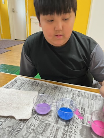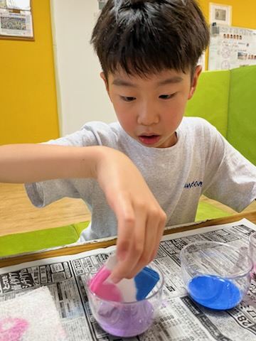 カップ🥎ボール運び&壁面制作! りぼんU 2025.05.19 今日は、公園でカップ🥎ボール運びをしました!『おっとっと』となりながらも、楽しんでお友達にボールを渡せていましたよ😊✨ 室内では、あじさいの制作で、染め紙をしました🎵 学校でもしたことがある子が多く、とても慣れた手つきで、丁寧に行えていました💮 偶然、ピンクの♡模様になった子や、綺麗なグラデーションが出来上がって、素敵な作品がたくさん出来上がりました✨ りぼんU