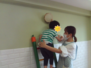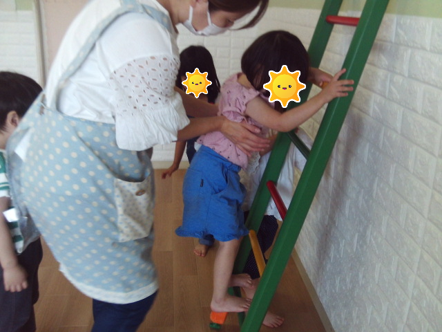 はしご登り タンバリンタッチ(^^♪ 未分類 2025.05.21 こんにちは 午前中は、公園に行きました 滑り台のぐるぐる棒に挑戦したり、散策をしていた お友達は、大きな木で何かを見つけたようですね(^^♪ 色々な虫を見つけたり、これから咲く紫陽花も楽しみ です 何が見えたのかな? ぐるぐる棒に挑戦したよ 午後のサーキットは、 床に貼られた赤いテープの上に立ち はしごを登り、タンバリンをタッチしてゆっくりと 降ります 一段一段よく見てしっかりと掴まり登り降りが出来ました お話をきちんと聞けたね はしごを登ってタンバリンにタッチ☆彡 しっかり掴まって登れているね♬ まつだいら