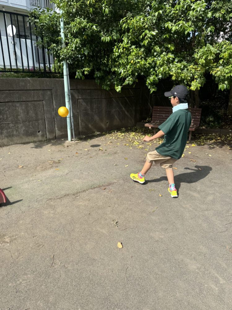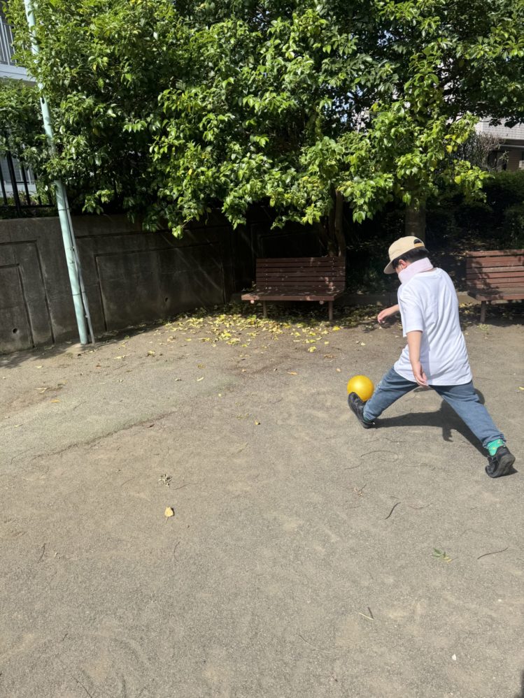 しじゅうから第二公園の壁に向かってボールを蹴り、跳ね返ってきたボールをもう一度蹴るということをしました!ボールがどこに跳ね返ってくるかよく見て頑張っていました!!