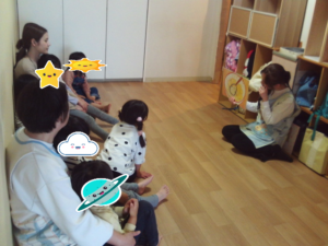 たくさん遊んだ後はクールダウンの時間です。紙芝居を見ました。