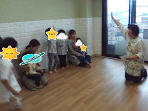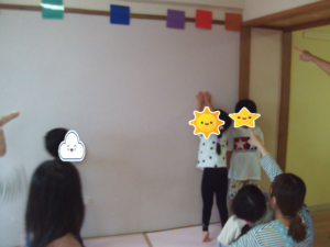 隣の部屋に貼ってある赤い色を指さしに行くルールで行いました。年長さんたちが見本になって活躍してくれました。