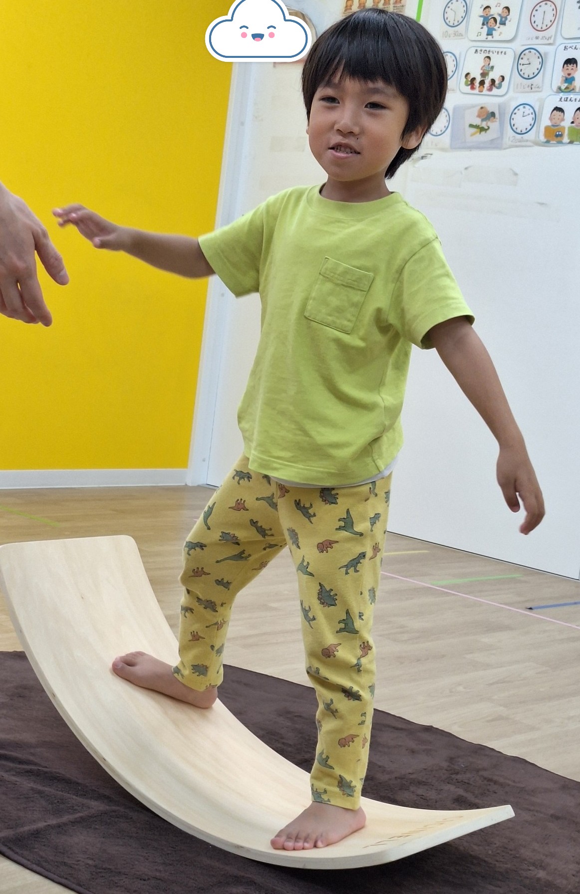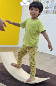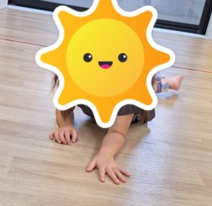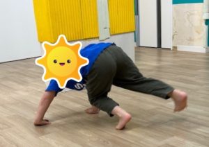 スタッフが子どもたちに魔法をかけ、いろいろな動物に変身! くま、うさぎ、ワニ、ラッコ、カエル、いぬになってその動物の真似をして体を動かしました。ジャンプしたり、四つん這いになって歩いたり、腹ばいやうつ伏せになって進んだりと、体のいろいろな場所を使うことが出来ました。