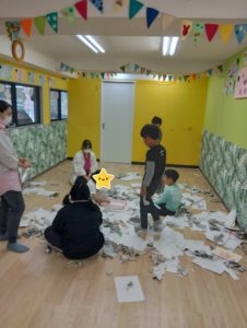 新聞ちぎって、雨のように降らせて思いっきり遊びました(*^-^*)