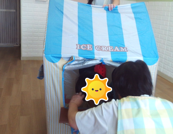 アイス屋さんになりきり、テント外にいるお友達や先生にアイスを