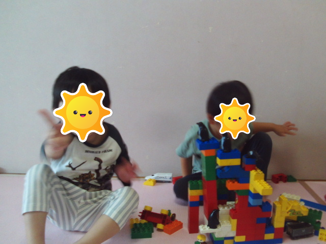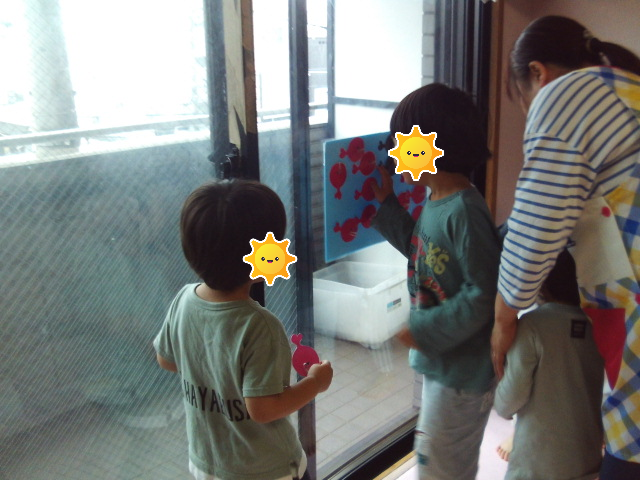 お部屋の中に逃げた金魚を探し、窓に貼られた