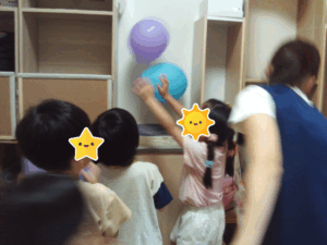 午後の風船遊びで空気清浄機の上に風船を