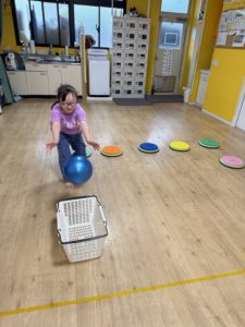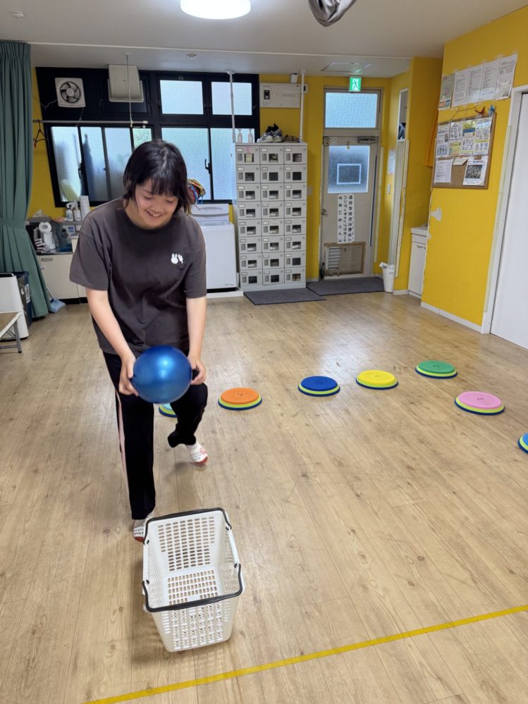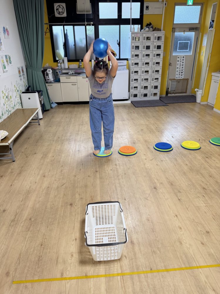 ボールを持ちながらドレミマットを踏み、かごにボールを入れました。