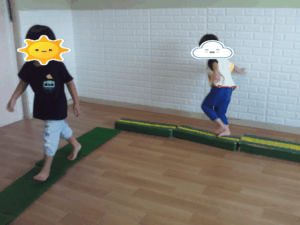 前の人を抜かさない、同じ方向に進むお約束で人工芝、一本渡りの上を歩きました。下にはワニがいる設定でした。「ワニ来るかな~!」と下を見ながら歩くお友達もいました。