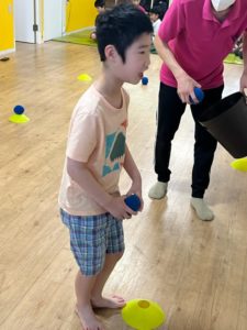 室内では、マーカーの小さい穴の上にペガーボールを乗せる活動をしました。