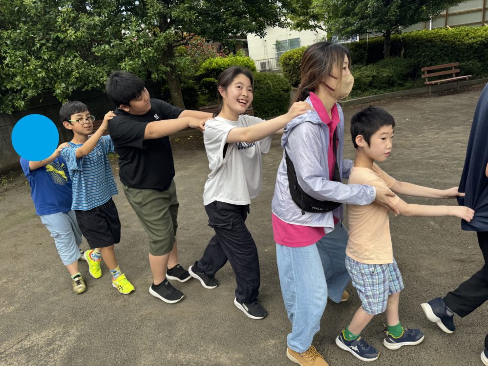 しじゅうから第二公園に行き、ブランコの柵の前からすべり台のそばにある壁まで列になって歩き、壁にタッチをしてスタートのところに戻ってきました。