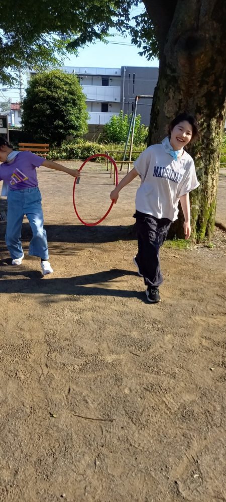 フープリレー○ りぼんU 2025.06.18 こんにちは。 6月17日(火)のりぼんUでは前半は来月の七夕飾りの為の短冊作りのお手伝いをしてもらいました😊✨安全装置付きの裁断機で紙を同じ大きさにカットしてもらいとても助かりました🎵 後半は暑さ対策をしっかりとして公園でフープリレーをしました!お友達とペアになって木を一周!途中で速さのペースが合わず手が離れるお友達もいましたが声掛けをすると最後まで一緒にゴール✨ りぼんU