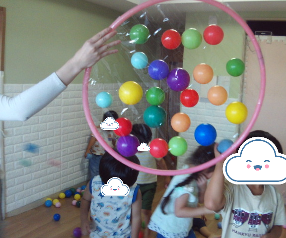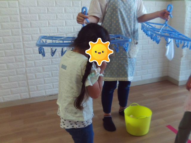 今日の室内遊びは『洗濯物遊び』『カラーボール的当て』