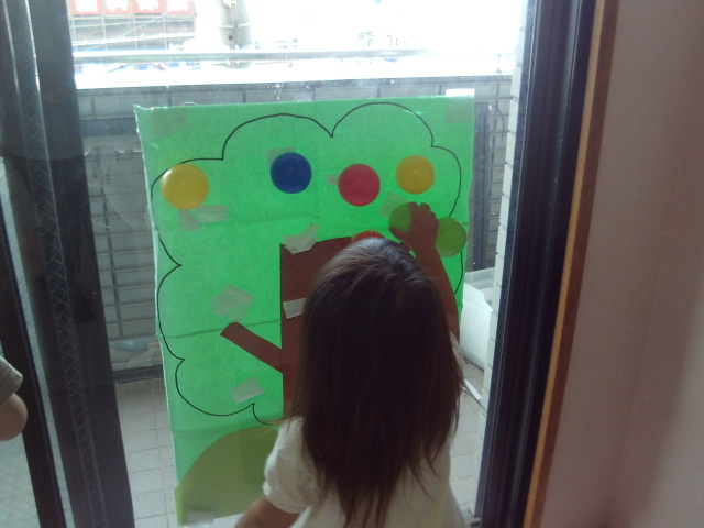 今日の室内遊びは、「金魚が逃げた」「果物の木」