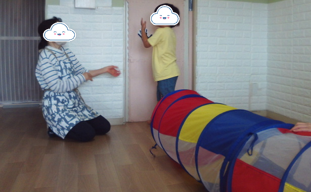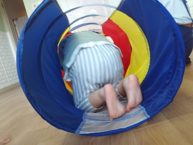 トンネルをしました。2連につなげたトンネルを通って出てきたら手形にタッチします。トンネルの外からお友達が通っているのを楽しそうに見ているお友達もいました。(トンネルのメッシュの所から中の様子が見れます)