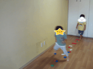 これはニューブロックをサーキットふうに並べて遊んでいる様子です。年長さんのお友達が並べてくれて飛んでいる所を見た子が参加しだしました。