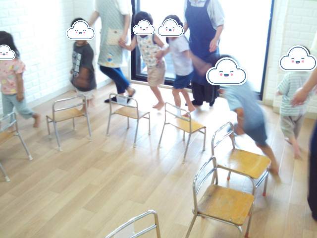 人数分の椅子の円の周りをみんなと速度で歩いたり