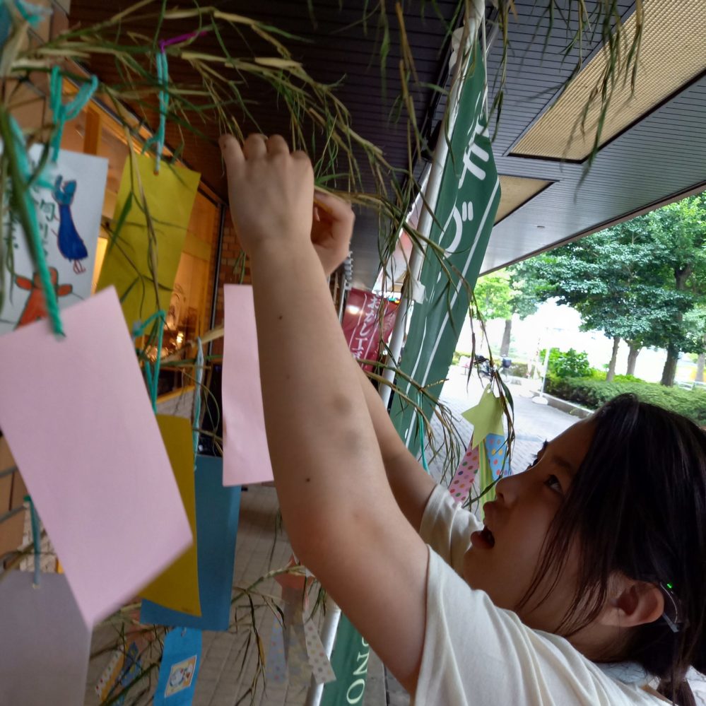 りぼんUでは毎年恒例で本物の笹に短冊をつけ、お願いことや絵などを飾りました。