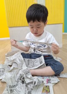 その後は新聞紙遊びをしました、ちぎったり、丸めたり、散らしたりして新聞紙の感触を楽しみました。新聞紙のお家も作ったのですが、作るよりも壊すほうが楽しくなってしまい、あっという間に破かれて壊れ、大きなお友だちががっかりしていました。また作ろうね☆