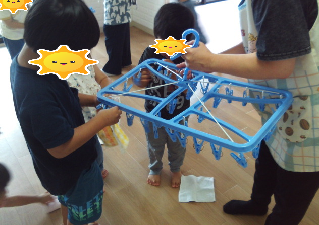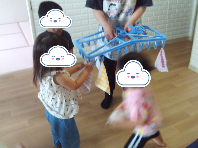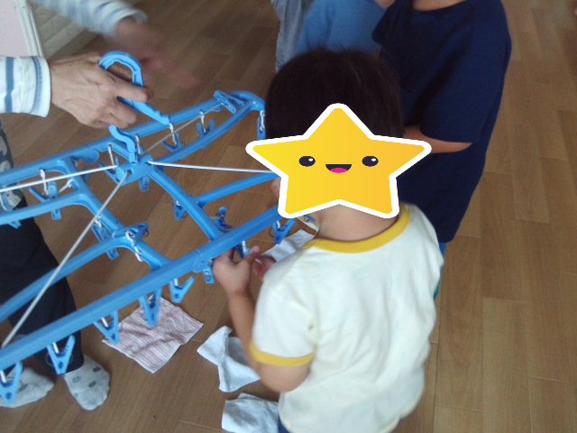 洗濯物ごっこ ワクワク 2025.07.08 こんにちは(#^^#) 今日の室内遊びは、洗濯物ごっこ、しっぽ取り、指さしゲーム、あぶくだったをしました。 写真はハンドタオルを洗濯物クリップに付ける所です。みんなで協力して用意してあったハンドタオルを全部干せたよ🧦 指さしゲームではまず名前を言ったものを指さす、その次にヒントを出して何か考え指さすという感じで遊びました。「お耳の長ーい動物は?」の問いに「うさぎ!」と元気に答えてくれたお友達もいました🎵 やまもと