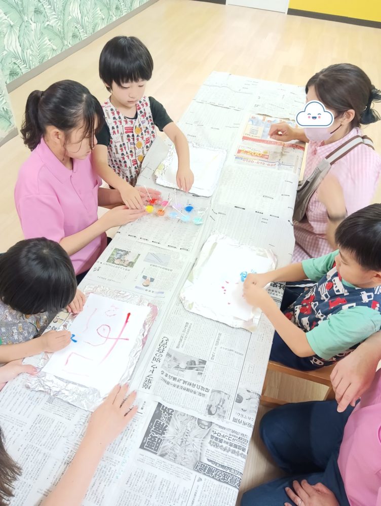 濡れた画用紙に絵の具をつけて。。。