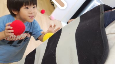 その後はボールプールや風船遊びをしていきました。ボールプールでは小さいお友だちに大人気でした!大きいお友だちは風船でスタッフとラリーに挑戦。沢山ラリーがつながりましたよ✨落ちてきた風船を目で追い、床に落ちないように上にあげていく遊びは、目と手の連動の動きを高めることにもつながっていきます。