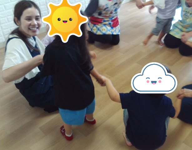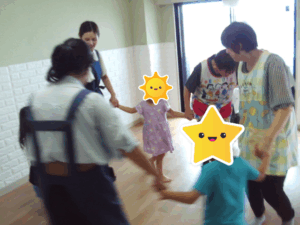 先生やお友達みんなで丸くなって手を繋ぎ、輪を作りました。