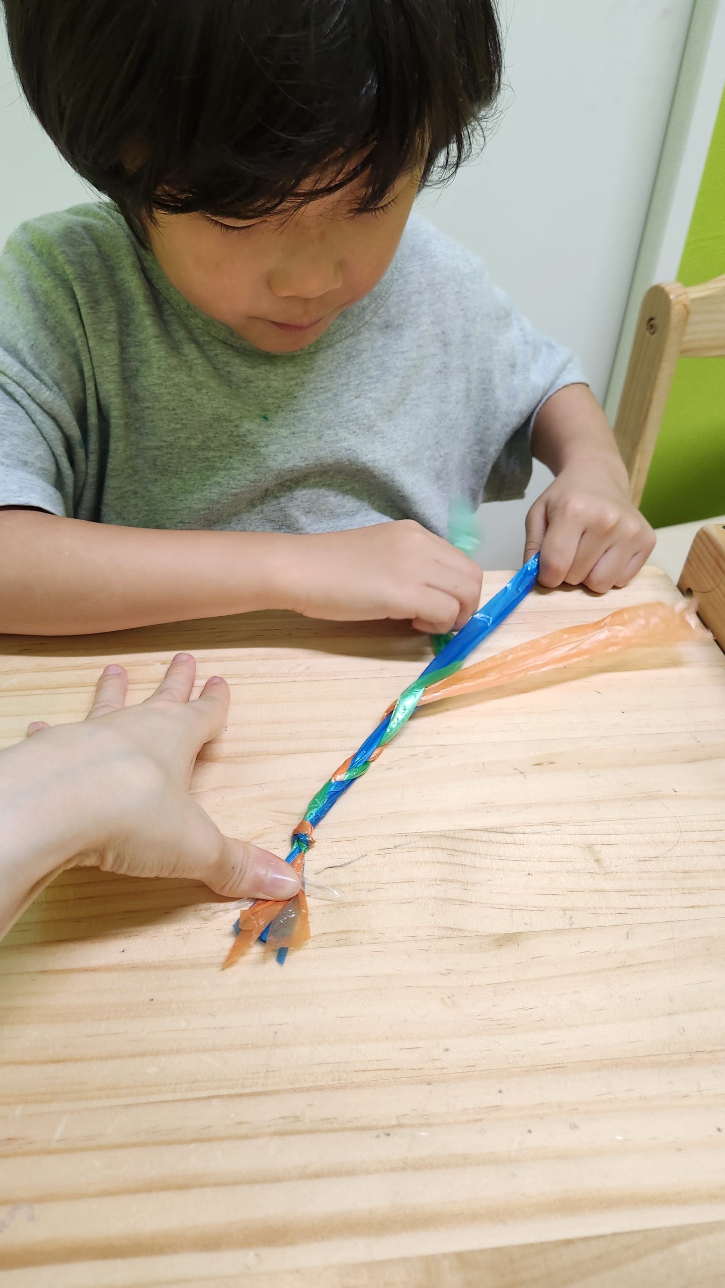 クレヨンで描いたり、スズランテープを三つ編みしたり…