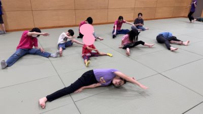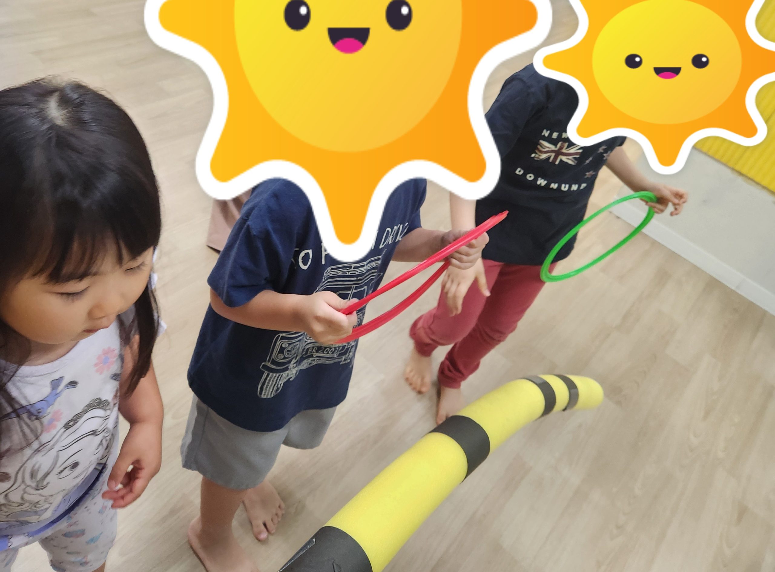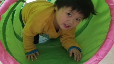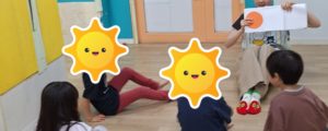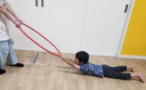 その後はフープ遊びをしました。信号ゲームをした後に行った為、小さいフープを使ってみんなには車に変身をしてもらいました!遮断機の前で止まることも出来ました☆
