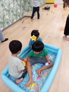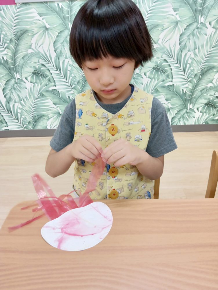 水曜日のりぼん りぼん 2025.07.25 こんにちは! 7月16日水曜日のりぼんは 午前はリズム遊び 午後はボール遊びをしました。 ピアノに合わせて歩いたり。。。 音が鳴るマットで遊んでみたり。。。 太鼓に合わせて大きく腕を振って歩くおともだちです 自分でつくったにじみ絵で素敵なくらげ作りもしました( *´艸`) 午後はボール遊びです ボールプールは大人気! すぐにぎゅうぎゅう満員になっていました(^^)/ りぼん