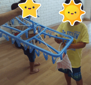 干し終わった後は、みんなで干したタオルをバケツに取り込んで