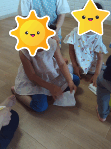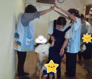 今日は室内遊びで、①洗濯物あそび②島ゲーム③ロンドン橋