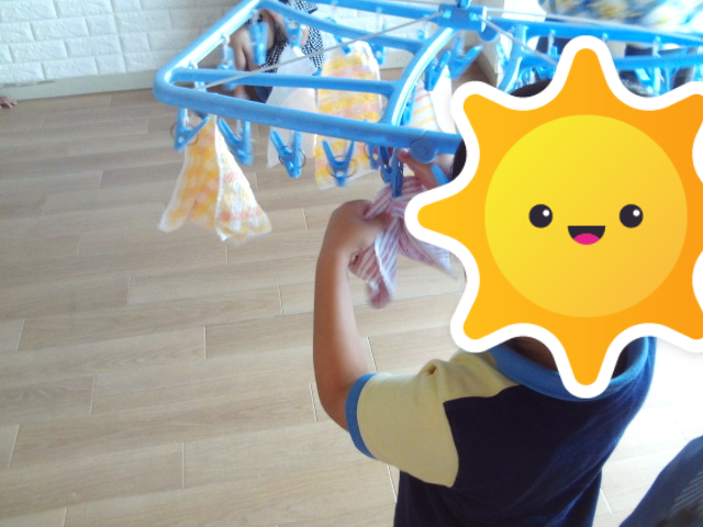 ピンチにつけて干していきました。「端を合わせてやるんだよ」と言いながら