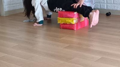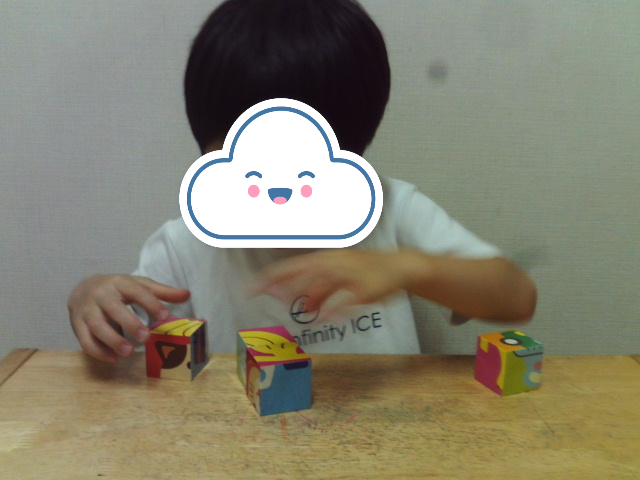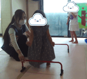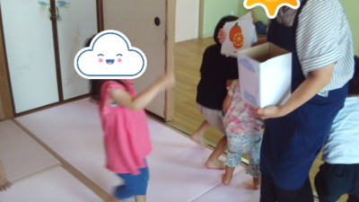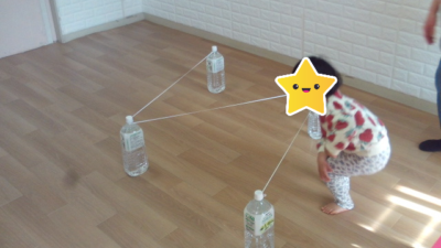 こんにちは。今日も室内遊びを楽しみました。果物の木にボールをつけて、帰りはハードルジャンプしてマットに戻ったよ。