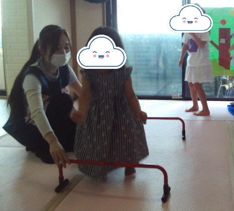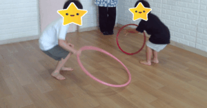 サーキットではフラフープを楽しみました!(^^)!フラフープをクルクルと回したり、フラフープに入って遊んだり、電車に見立てて遊びました。