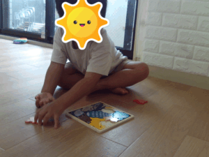 動物パズルを集中して組み合わせていました
