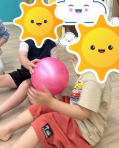 その後はみんなで輪になり座り、おとなりのお友だちにボールを渡すことも行いました。「おとなりへ、はい、おとなりへ、はい」の掛け声で渡していきましたよ。