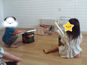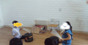 たいこ🥁 ワクワク 2025.08.13 こんにちは😊 朝の会でたいこをしました♬名前を呼ばれると前に来てたいこを叩きます。一緒に叩いている子の方を見たり、元気に叩いたり個性が出ていました(^^♪ あぶくたったをしました。鬼さん役を年長さんが勤めてくれました。それを見て年下のお友達も学んでいっています。「トントントン何の音?」と聞くと「鬼!」と返しているお友達もいました(#^^#)