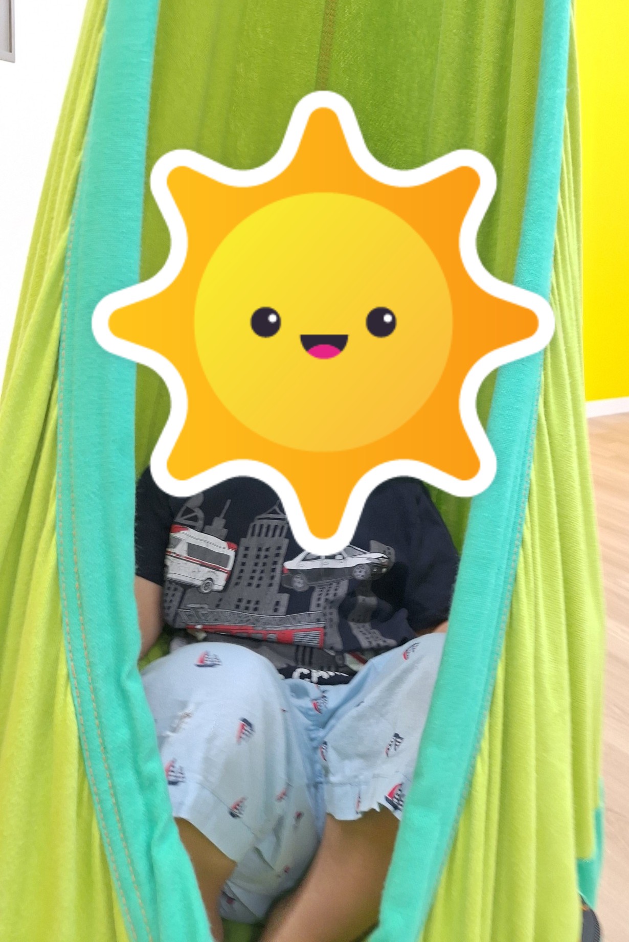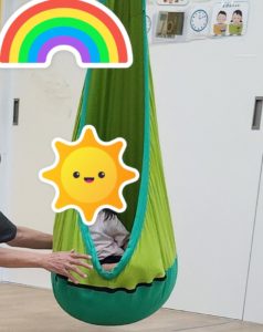 その後はハンモックを楽しみました。ハンモックをすることで心地よい揺れからリラックスの効果があったり、感覚統合を促しバランス感覚や体幹を鍛える効果もあると言われています。