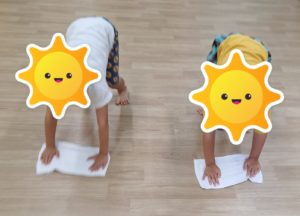 今日もぞうきんあそびをしました。朝の会で、「お尻を高く上げて膝を付かないように雑巾をかけてね」と伝えると、意識して上手に雑巾がけができました。