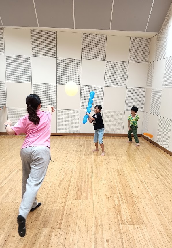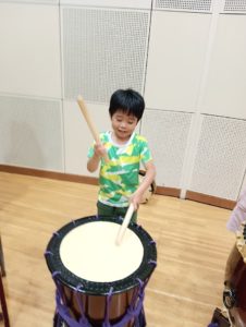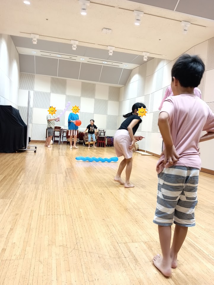午後はこもれびホールの音楽練習室で風船遊びと和太鼓体験