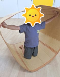 一人でキャタピラの中に入り、ハイハイの姿勢で進んだり、お友だちと一緒にキャタピラに入り、相手と息を合わせて進んだりしました。全身運動、バランス感覚を意識して行っていますが、子どもたちはこの活動が好きで楽しんでいるようです。