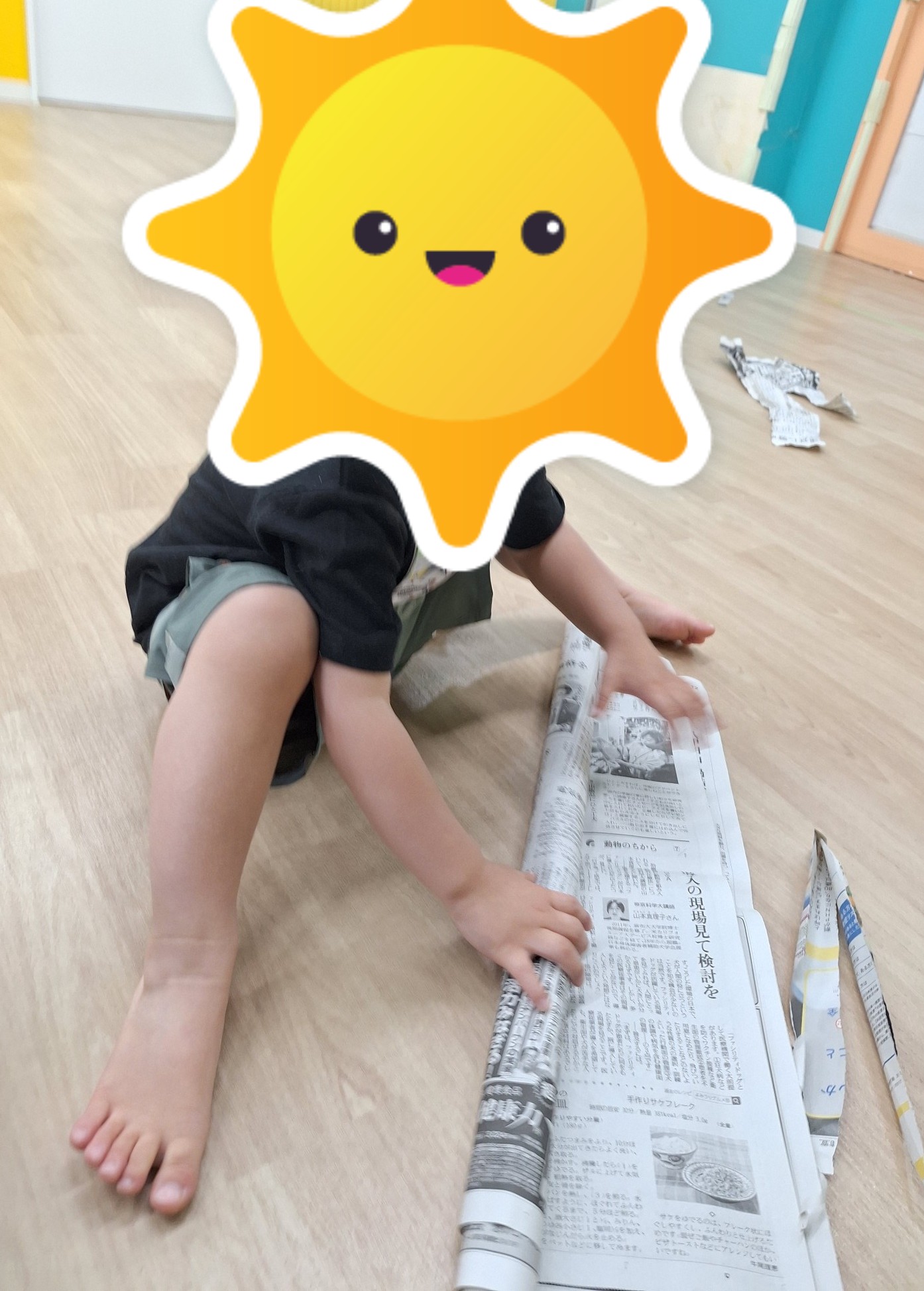 新聞紙遊びでは、お家を作ってお友だちと一緒に入ったり、新聞紙を長細く巻いて剣やバット、お掃除のホウキにしたりしていろいろな遊びを楽しんでいました。もちろん、ちぎったり、散らしたりすることも楽しんでいましたよ。
