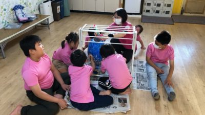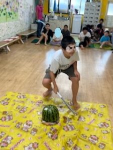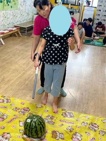 スイカ割りでは、小さい子から順にやりましたが、自分の順番の前にスイカが割れてしまっていないかとヒヤヒヤした中学生たちが、毎回スイカを確認に行く姿が、健気でした(笑)