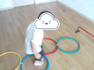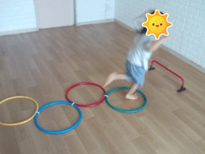 ジグザグに並んだフラフープを両足跳びや片足跳びで進み、