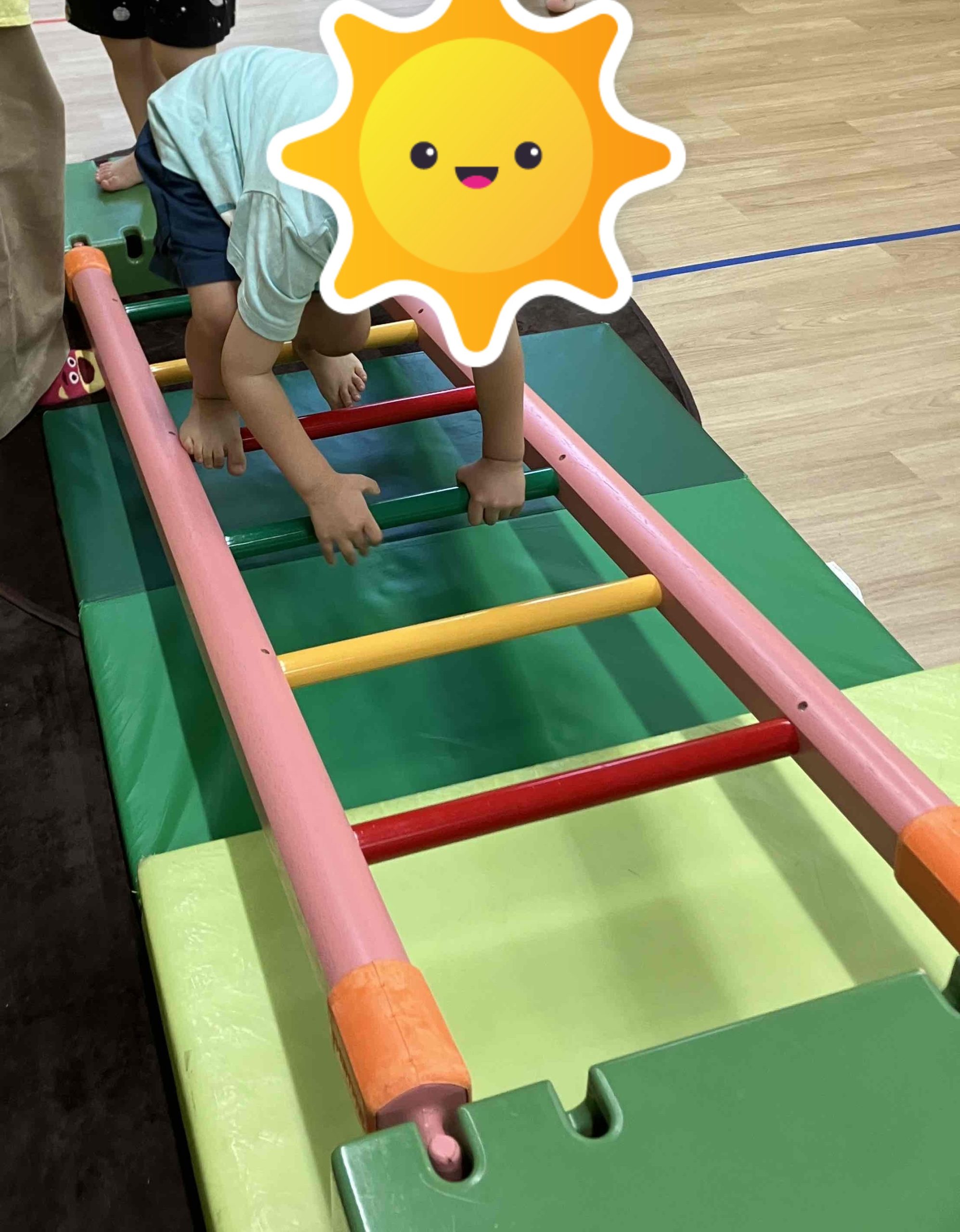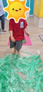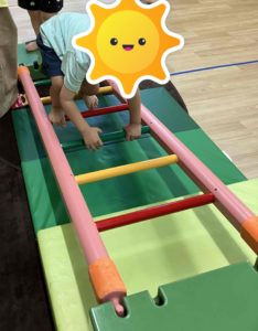 今日も午前中の活動は「感触遊び」をしました。梯子、トンネル、ウォーターマット、感触マットをしました。そして今日は、スズランテープの道の上を歩いて渡ることも楽しみましたよ♪ 梯子の坂を登ることも上手になってきています。足の裏の感触を十分に感じながら、全身を動かしていきました。