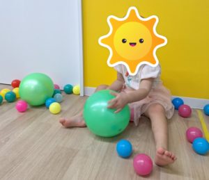 その後はボール遊びをしました。今日は、スタッフが持っているかごにボールを投げ入れる活動をしましたよ。たくさん入ったかごの中のボールを上から降らせることも楽しみましたよ♪