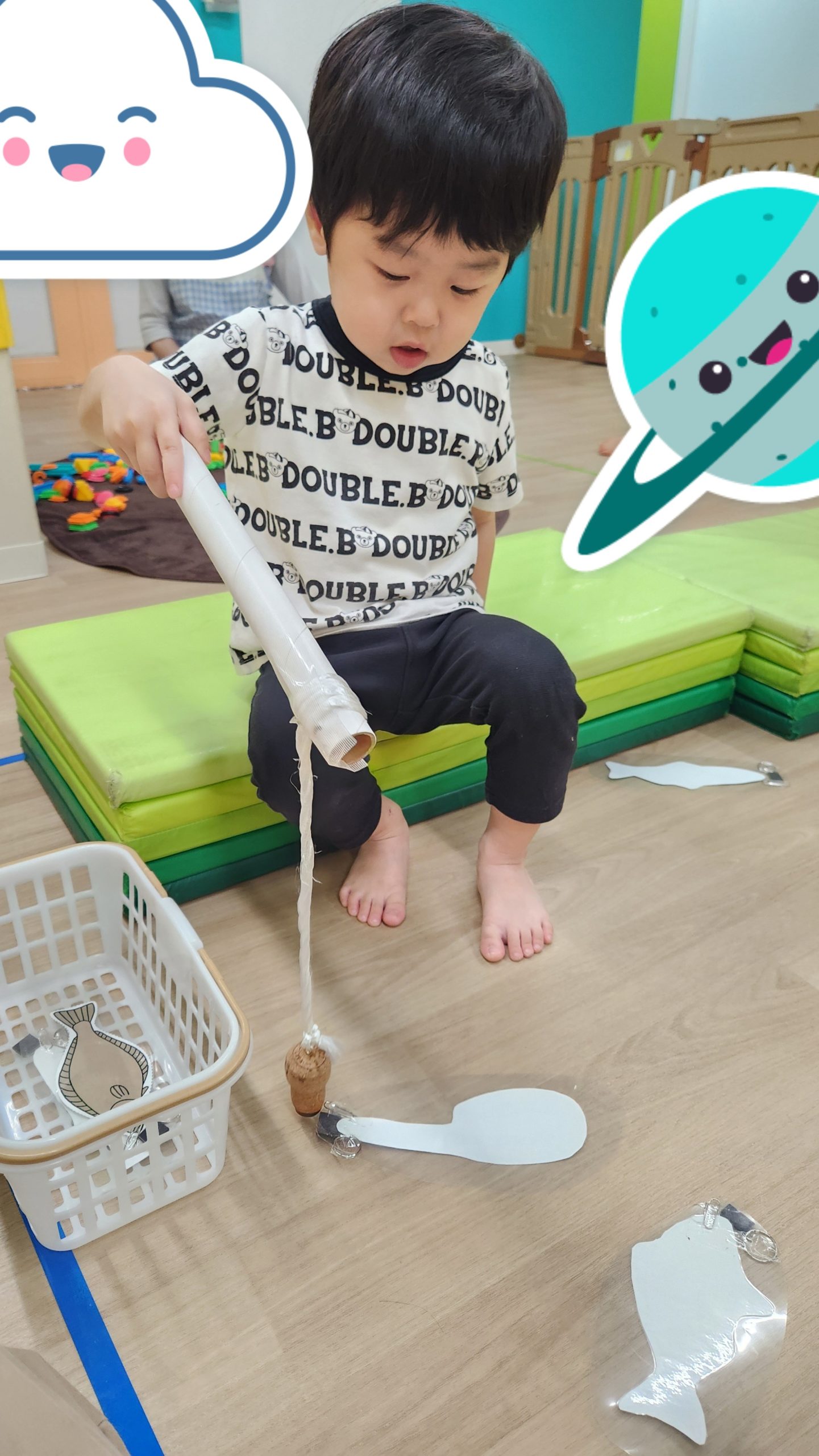 コーナー遊びでは、ペッタブロック、積み木、魚釣りをしました。