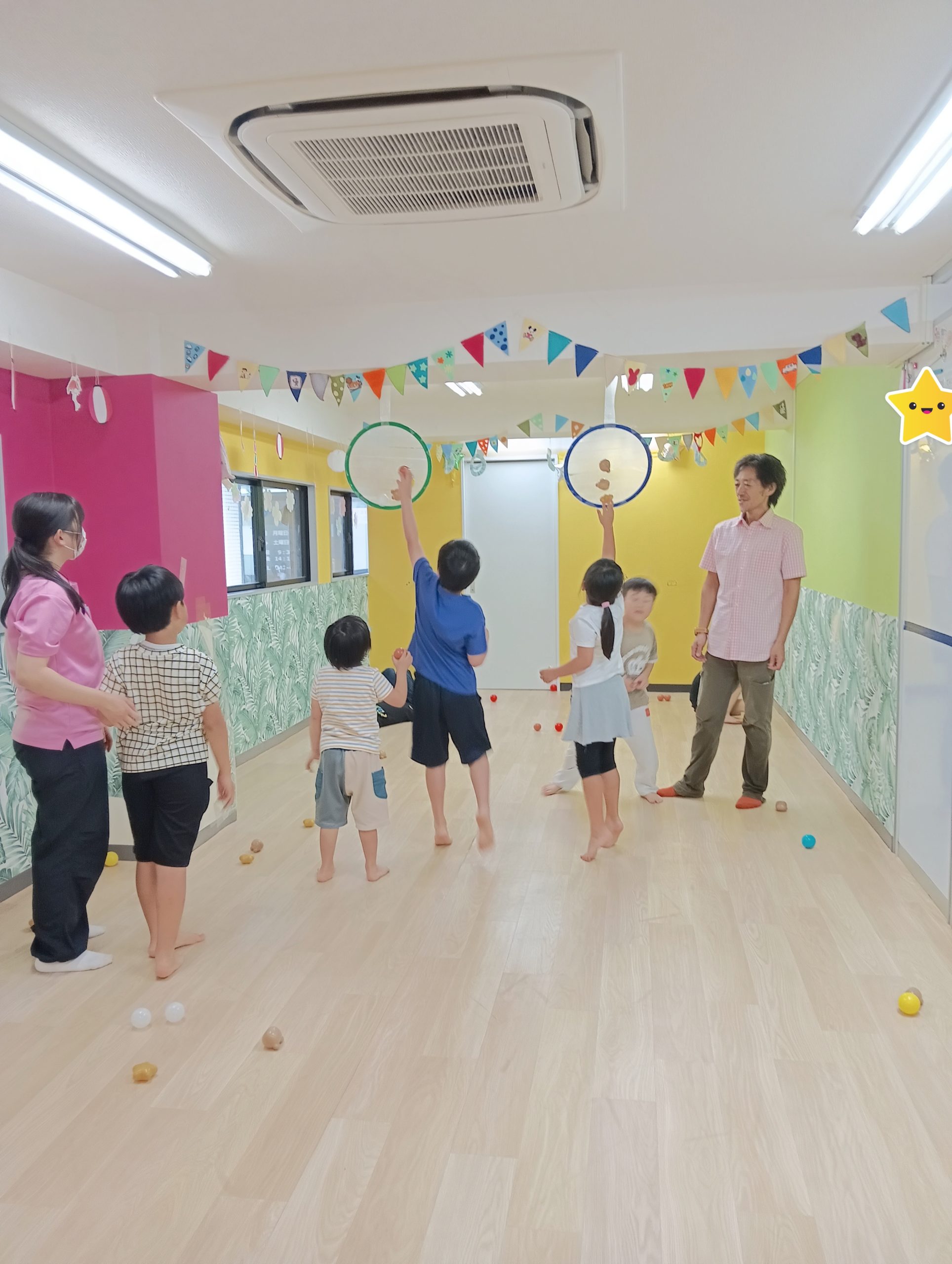 木曜日のりぼん りぼん 2025.09.12 こんにちは! 9月11日木曜日のりぼんは 的当てをしました。 カラーボールを床に広げると ものすごい勢いでみんな集まってきて どんどん的に目がけて投げます!! みんな今年の夏も大きくなって なんだか的が低いように感じますね(*´▽`*) 外は大雨でしたが、 室内でいっぱい体を動かすことができたりぼんでした。 りぼん