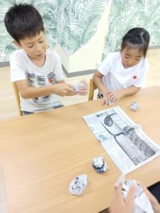 力をこめてぎゅっぎゅっと新聞紙を丸めていくおともだちです。
