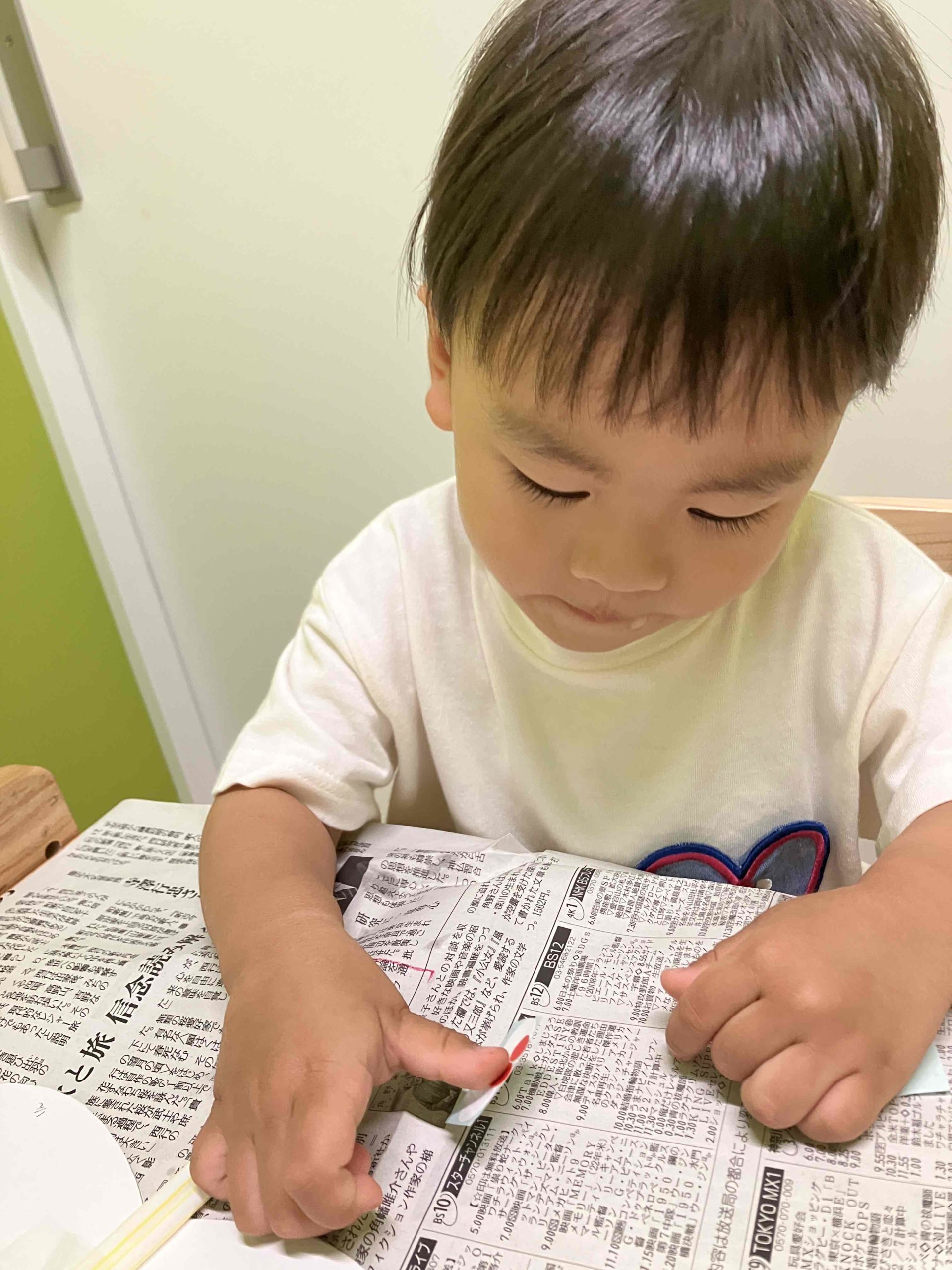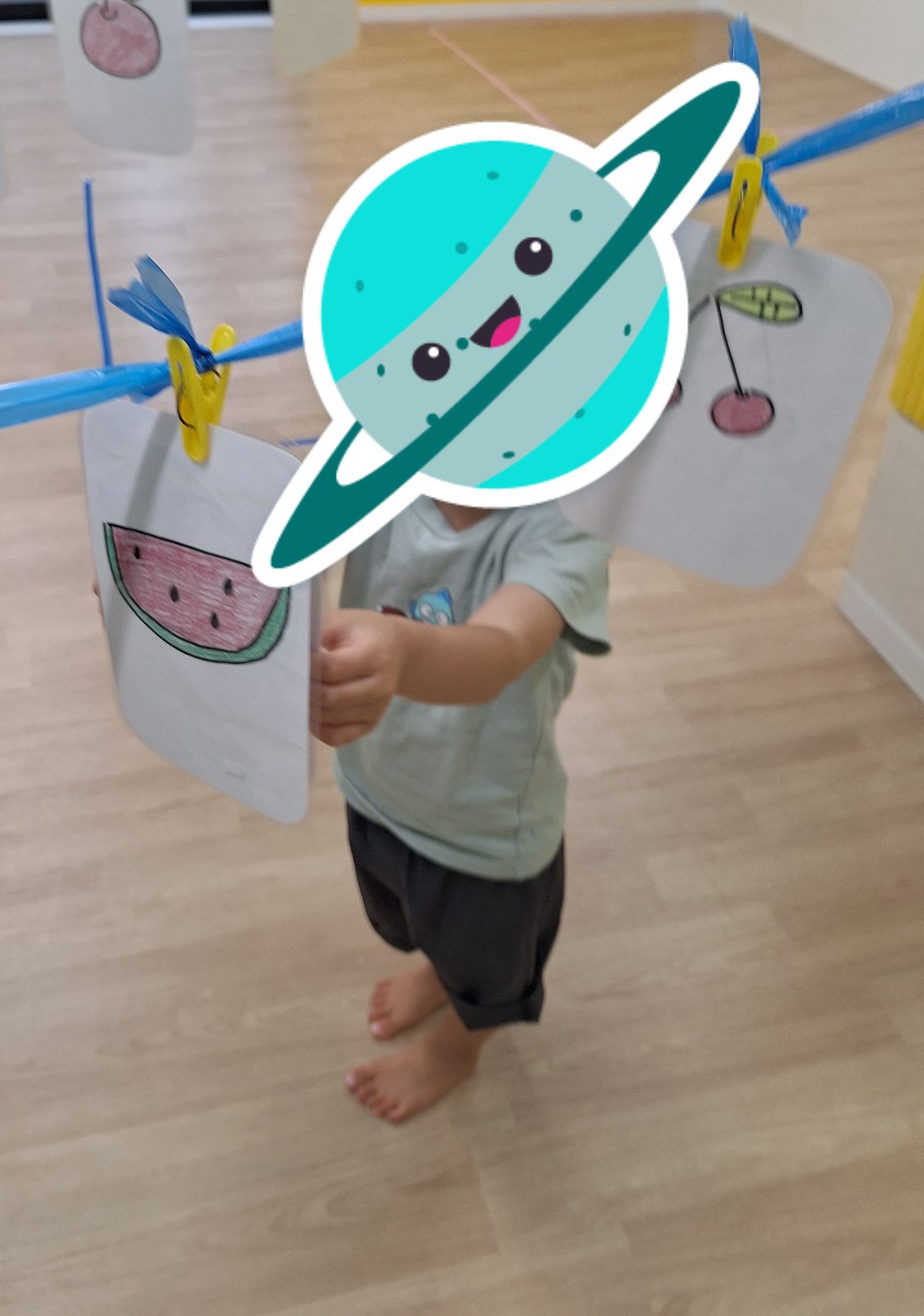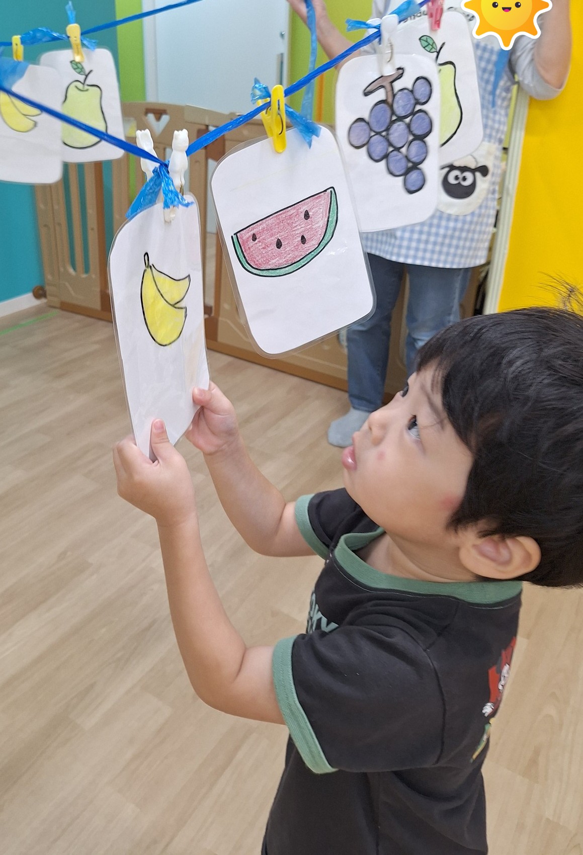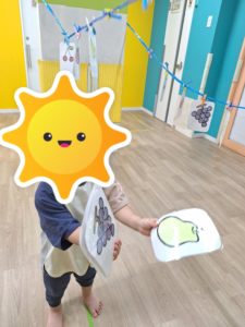 果物の札を見せ、「これ何?」と聞くと、